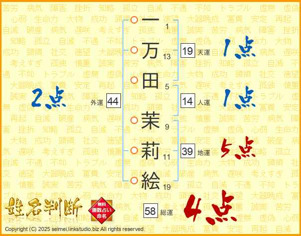 一(1画)万(13画)田(5画) 茉(9画)莉(11画)絵(19画)