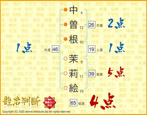 中(4画)曽(12画)根(10画) 茉(9画)莉(11画)絵(19画)
