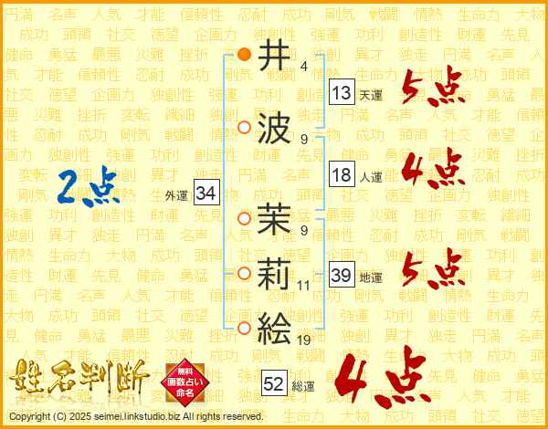 井(4画)波(9画) 茉(9画)莉(11画)絵(19画)