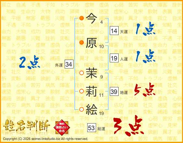 今(4画)原(10画) 茉(9画)莉(11画)絵(19画)
