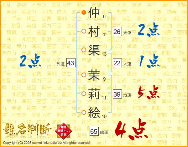 仲村渠茉莉絵さんの総運は65画の4点!