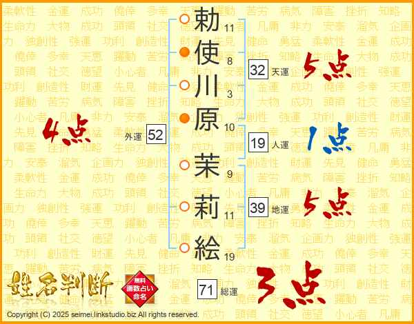勅(11画)使(8画)川(3画)原(10画) 茉(9画)莉(11画)絵(19画)