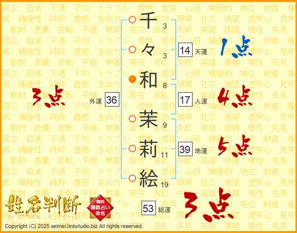 千(3画)々(3画)和(8画) 茉(9画)莉(11画)絵(19画)