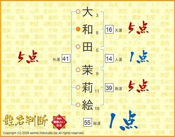 大(3画)和(8画)田(5画) 茉(9画)莉(11画)絵(19画)