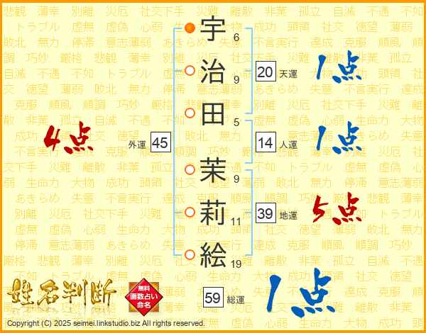 宇(6画)治(9画)田(5画) 茉(9画)莉(11画)絵(19画)