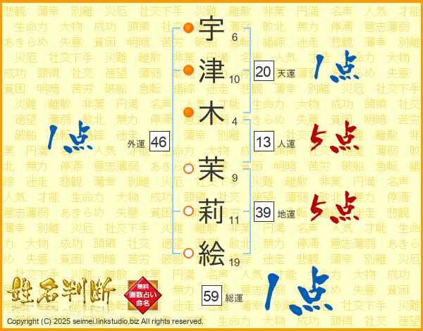 宇(6画)津(10画)木(4画) 茉(9画)莉(11画)絵(19画)
