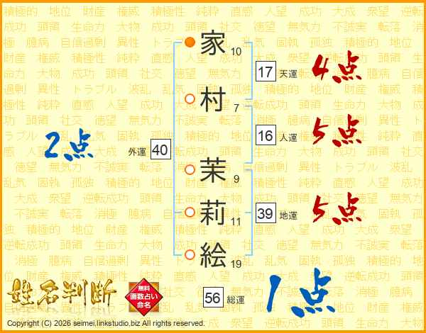家(10画)村(7画) 茉(9画)莉(11画)絵(19画)