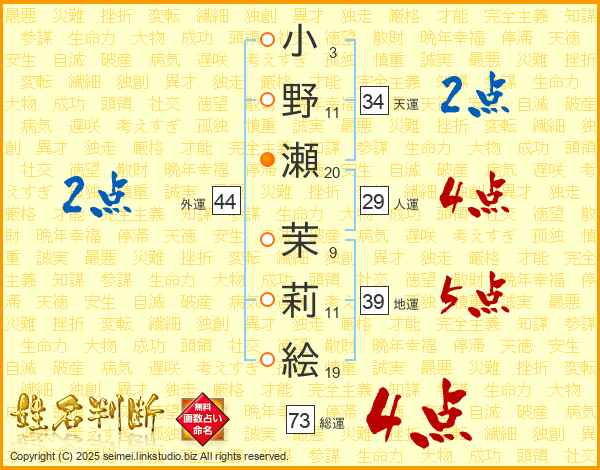 小野瀬茉莉絵さんの総運は73画の4点!