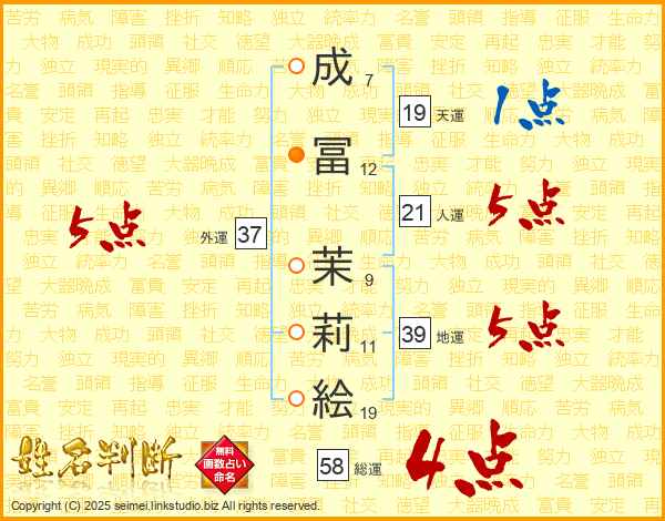 成(7画)冨(12画) 茉(9画)莉(11画)絵(19画)