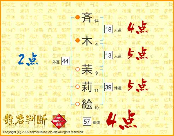 斉(14画)木(4画) 茉(9画)莉(11画)絵(19画)