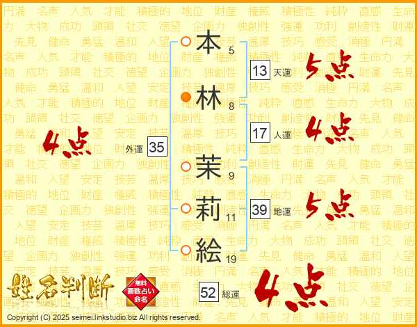 本(5画)林(8画) 茉(9画)莉(11画)絵(19画)
