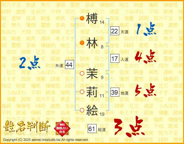 榑(14画)林(8画) 茉(9画)莉(11画)絵(19画)