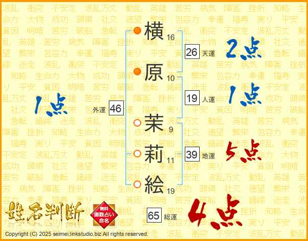 横(16画)原(10画) 茉(9画)莉(11画)絵(19画)
