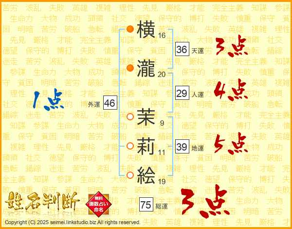 横(16画)瀧(20画) 茉(9画)莉(11画)絵(19画)