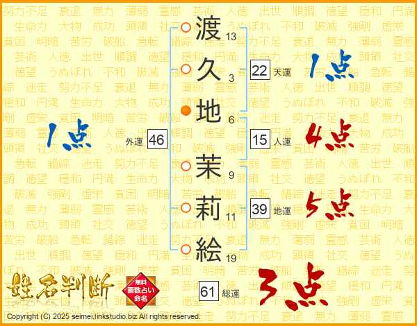 渡(13画)久(3画)地(6画) 茉(9画)莉(11画)絵(19画)