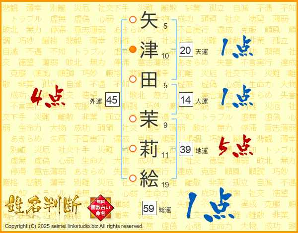 矢(5画)津(10画)田(5画) 茉(9画)莉(11画)絵(19画)