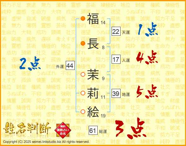 福(14画)長(8画) 茉(9画)莉(11画)絵(19画)