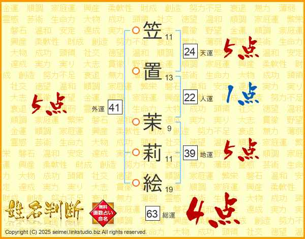 笠(11画)置(13画) 茉(9画)莉(11画)絵(19画)