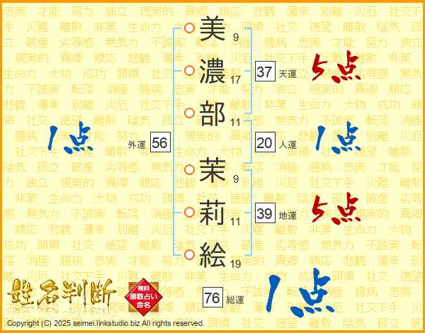 美(9画)濃(17画)部(11画) 茉(9画)莉(11画)絵(19画)