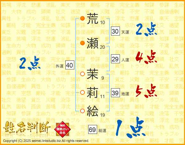 荒(10画)瀬(20画) 茉(9画)莉(11画)絵(19画)