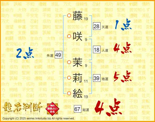藤(19画)咲(9画) 茉(9画)莉(11画)絵(19画)