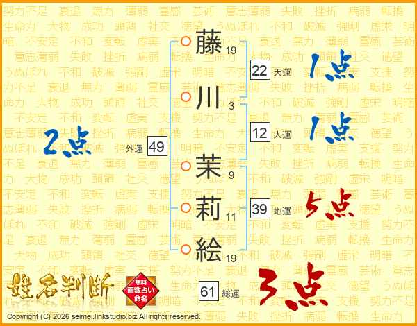 藤川茉莉絵さんの地運は39画の5点!
