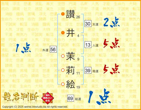 讃(26画)井(4画) 茉(9画)莉(11画)絵(19画)