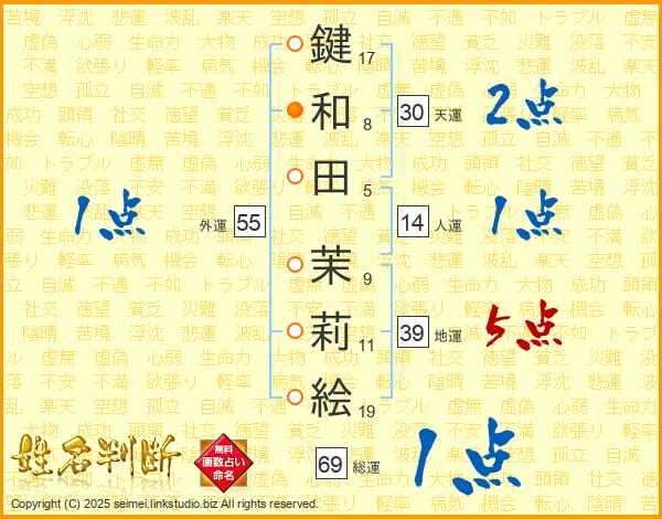 鍵(17画)和(8画)田(5画) 茉(9画)莉(11画)絵(19画)