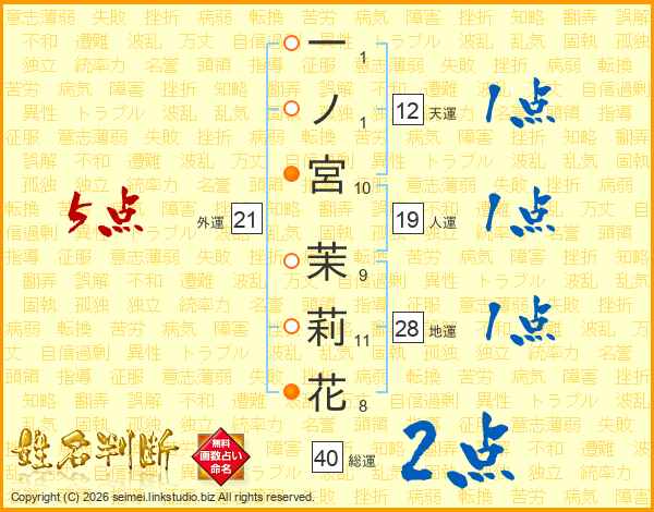 一(1画)ノ(1画)宮(10画) 茉(9画)莉(11画)花(8画)