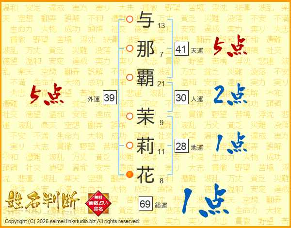 与(13画)那(7画)覇(21画) 茉(9画)莉(11画)花(8画)
