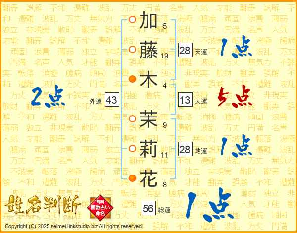加(5画)藤(19画)木(4画) 茉(9画)莉(11画)花(8画)