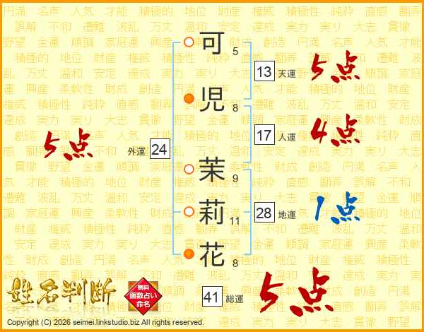 可(5画)児(8画) 茉(9画)莉(11画)花(8画)