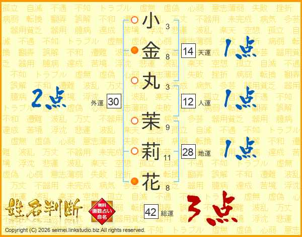 小(3画)金(8画)丸(3画) 茉(9画)莉(11画)花(8画)