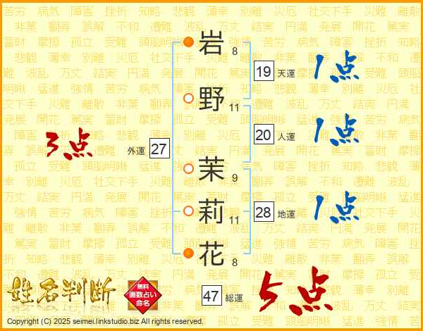 岩(8画)野(11画) 茉(9画)莉(11画)花(8画)