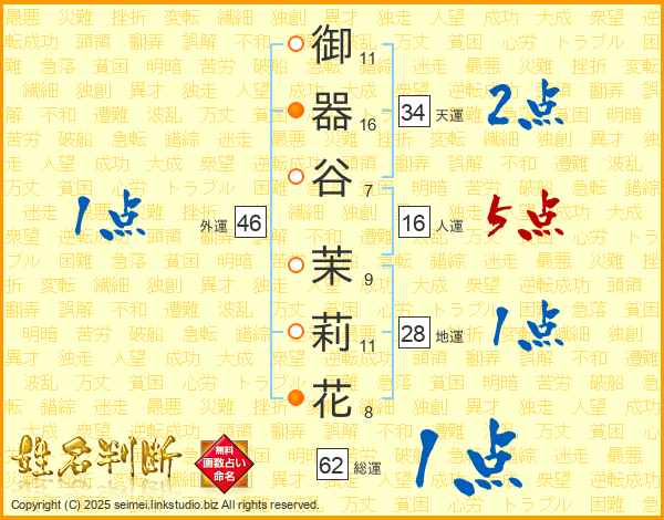御(11画)器(16画)谷(7画) 茉(9画)莉(11画)花(8画)