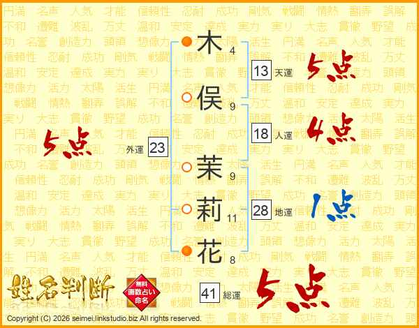 木(4画)俣(9画) 茉(9画)莉(11画)花(8画)