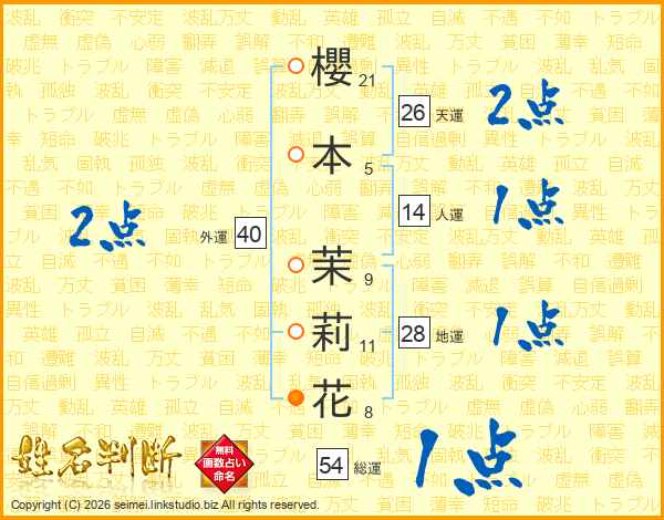 櫻(21画)本(5画) 茉(9画)莉(11画)花(8画)