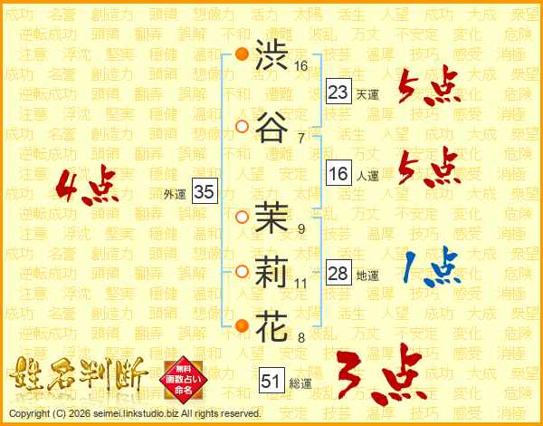 渋(16画)谷(7画) 茉(9画)莉(11画)花(8画)