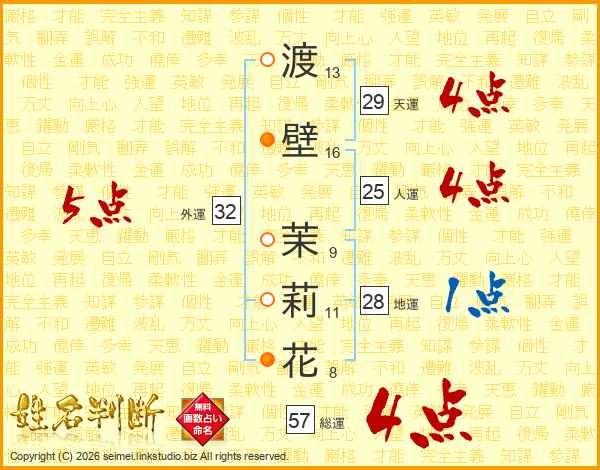 渡(13画)壁(16画) 茉(9画)莉(11画)花(8画)