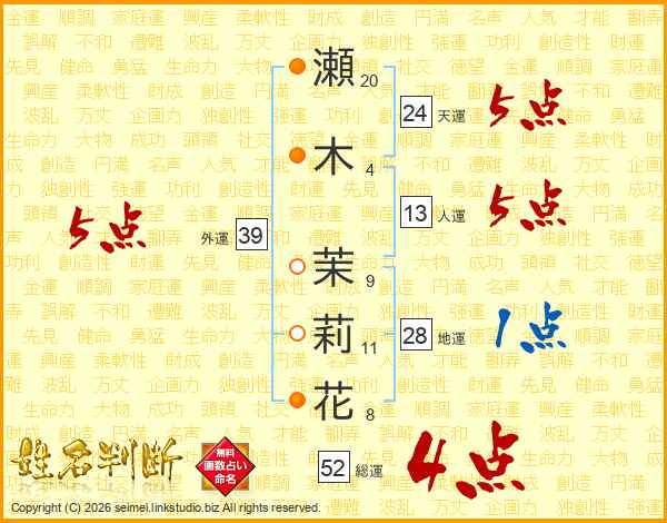 瀬木茉莉花さんの総運は52画の4点!