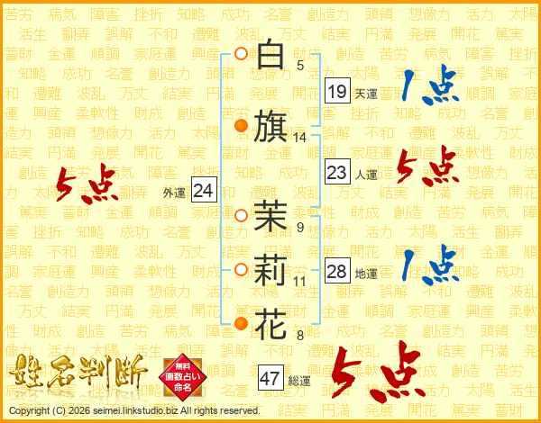 白(5画)旗(14画) 茉(9画)莉(11画)花(8画)