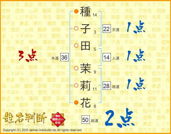 種(14画)子(3画)田(5画) 茉(9画)莉(11画)花(8画)