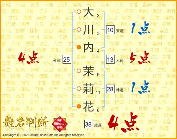 大(3画)川(3画)内(4画) 茉(9画)莉(11画)花(8画)