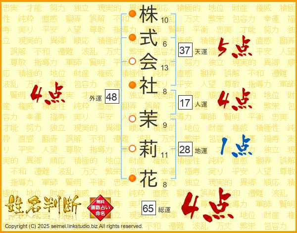 株(10画)式(6画)会(13画)社(8画) 茉(9画)莉(11画)花(8画)