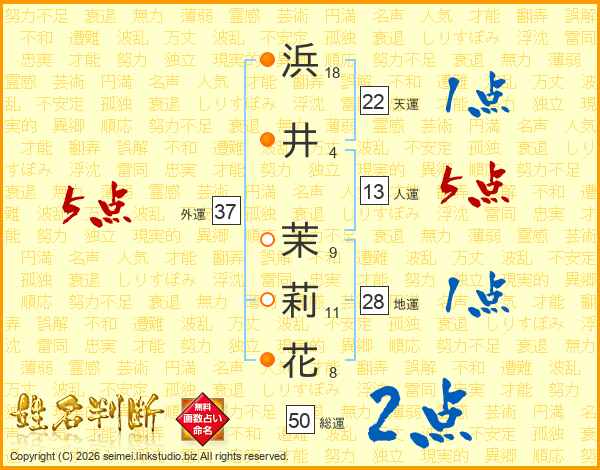 浜(18画)井(4画) 茉(9画)莉(11画)花(8画)