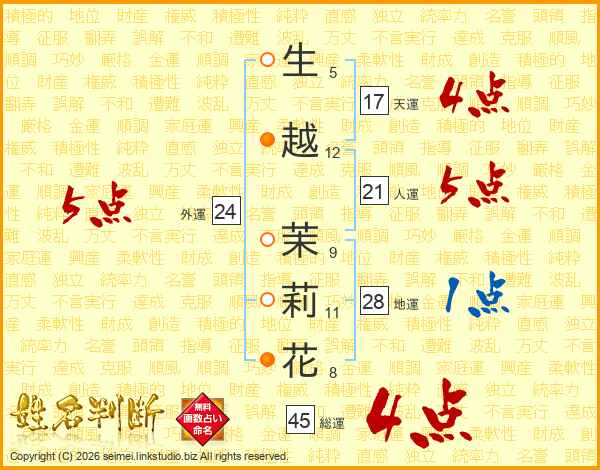 生越茉莉花さんの総運は45画の4点!