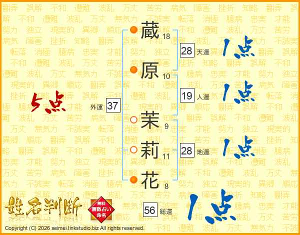 蔵(18画)原(10画) 茉(9画)莉(11画)花(8画)