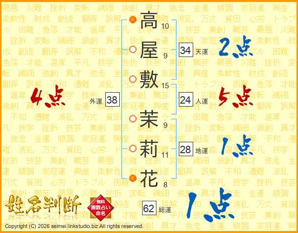 高屋敷茉莉花さんの総運は62画の1点!