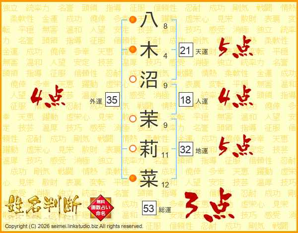八(8画)木(4画)沼(9画) 茉(9画)莉(11画)菜(12画)