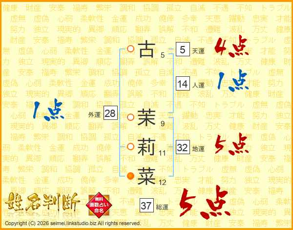 古茉莉菜さんの総運は37画の5点!